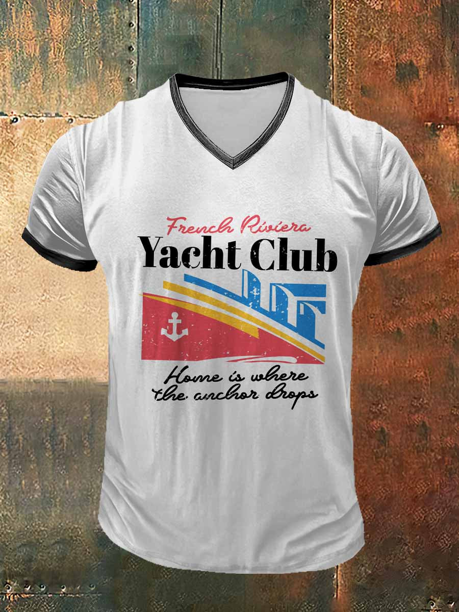 T-shirt col en V imprimé à manches courtes Yacht Club Vintage Fashion