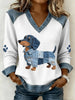 Femmes Mignon Teckel Motif Denim Patchwork Art V-Neck Top