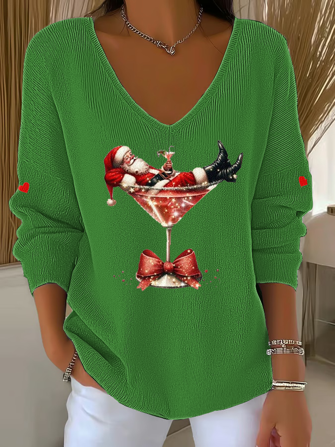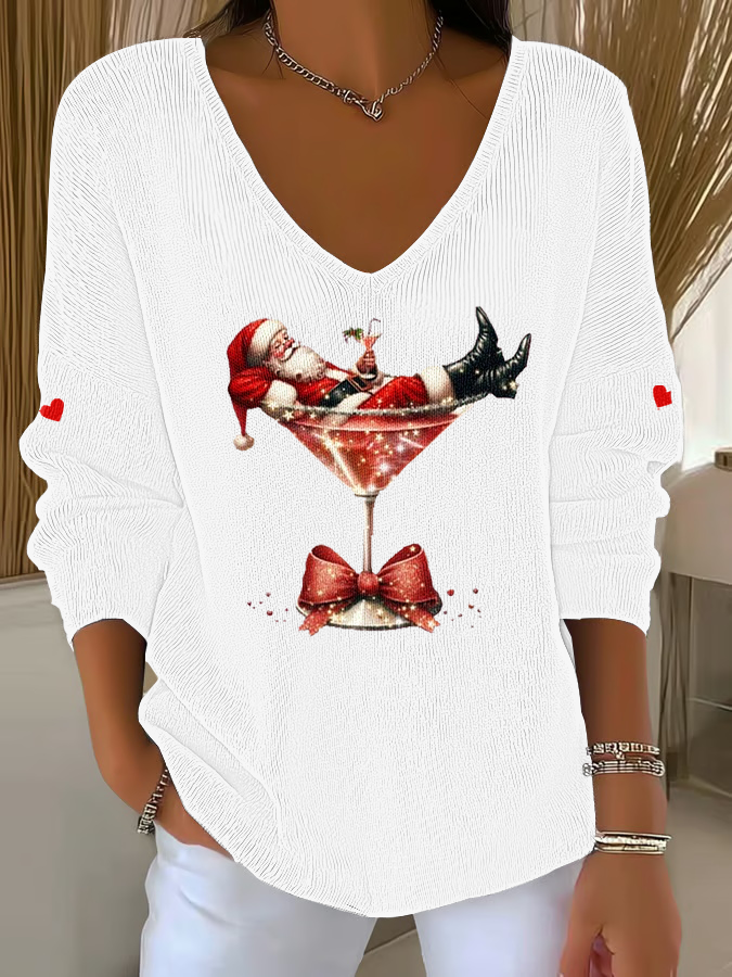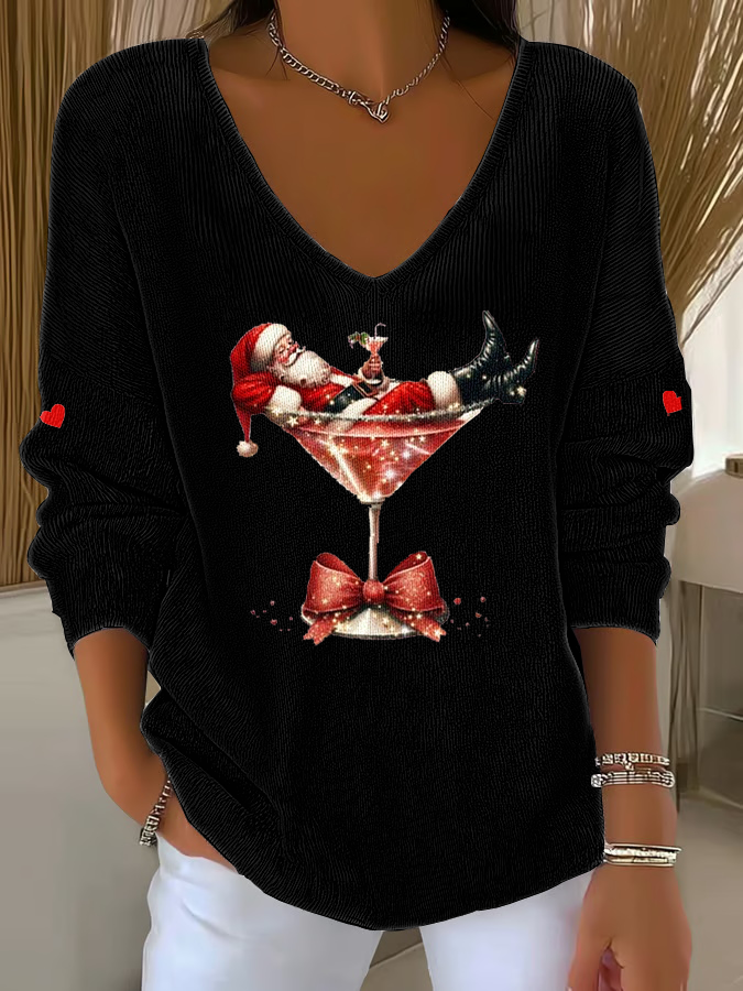 Haut côtelé à col en V Père Noël femme assis sur un verre à vin