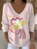 Pull Femme Petit Oiseau Brodé Ruban Rose Clair Col V