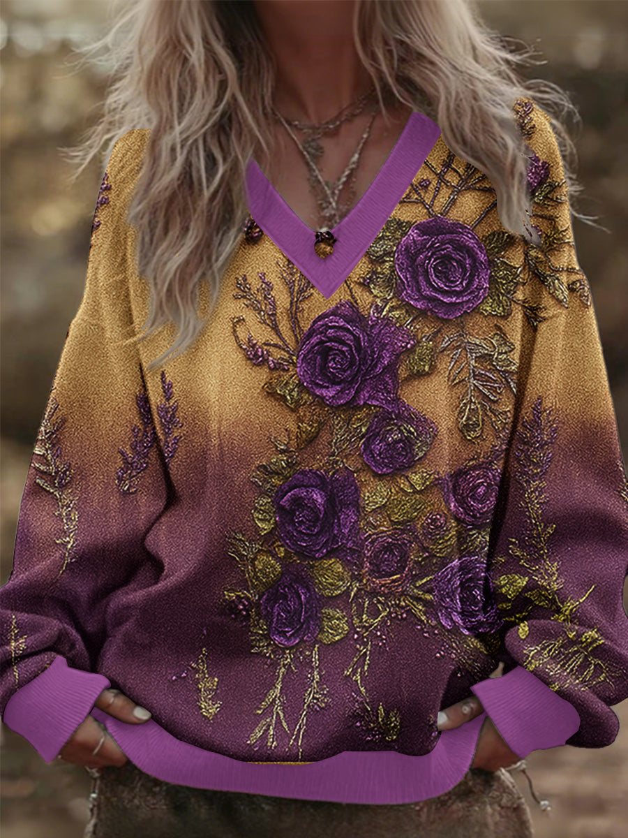 Sweat-shirt Dégradé 3D Floral à Col V Femme